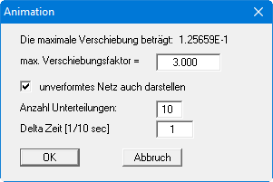 Es wird jedoch nicht nur der Endzustand dargestellt, sondern Sie geben unter "Anzahl Unterteilungen" und "Delta Zeit [1/10 sec]"vor, in welchen Teilschritten eine Verformungsdarstellung erfolgen soll. Dadurch entsteht ein zeichentrickfilmähnlicher Effekt. Die laufende Animation kann durch einen Klick auf die linke Maustaste abgebrochen werden.