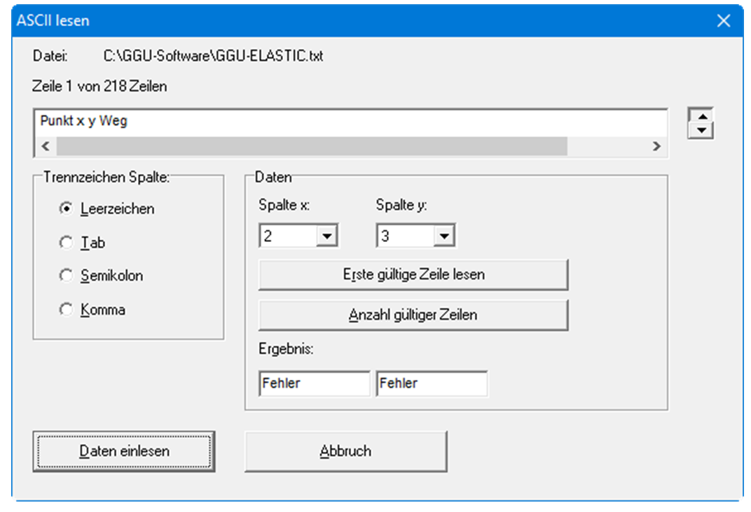 Oben wird die aktuelle Zeile der ASCII-Datei angezeigt. Mit den Pfeilen am rechten Rand bewegen Sie sich durch die Datei. In "Spalte x:" und "Spalte y:" geben Sie die Spaltennummer an, in der sich die entsprechenden Angaben befinden. Falls alle Angaben richtig sind, erscheint in der Box unter den Spalten das Ergebnis für diese Zeile. Anderenfalls erscheint eine Fehlermeldung. Verändern Sie gegebenenfalls das Trennzeichen für die Spalte.