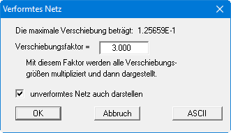 Sie können das verformte Netz darstellen lassen. Da im Allgemeinen die Verformungen klein gegenüber den Systemabmessungen sind, kann ein Faktor eingegeben werden, mit dem die aktuell berechneten Verschiebungen multipliziert werden.