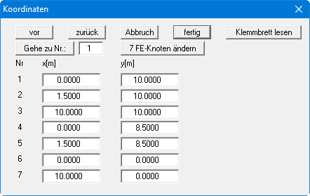 Das System lässt sich mit wenigen markanten Punkten beschreiben, so dass die Eingabe günstig über die Tabellenform erfolgen kann. Wählen Sie den Menüeintrag "FE-Netz / (Knoten) ändern" und dann den Knopf "über Tabelle". Ändern Sie die Anzahl der Knoten auf 7 und geben anschließend die Werte der nachfolgenden Dialogbox ein.