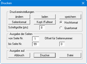 Mit dem Knopf "Seitenformat" stellen Sie unter anderem die Größe des linken Randes und die Zeilenanzahl pro Seite ein. Mit dem Knopf "Kopf-/Fußtext" können Sie für jede Seite einen Kopftext und einen Fußtext eingeben. Wenn innerhalb dieses Textes das Zeichen # erscheint, wird beim späteren Ausdruck hierfür die aktuelle Seitennummer eingesetzt (z.B. Seite #'). Die Größe der Schrift kann in "Pts" vorgegeben werden. Des Weiteren können Sie zwischen "Hochformat" und "Querformat" wechseln.