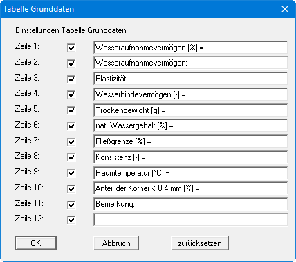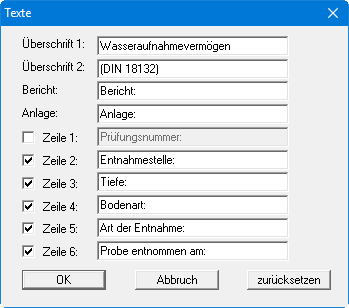 Ihre Eingaben in den Zeilen 1 bis 6 in der obigen Dialogbox ebenso wie die Eingaben unter "Bericht:" und "Anlage:" sind zugleich die Bezeichnungen der Eingabefelder in der Dialogbox des Menüeintrags "Bearbeiten / Allgemein". Wenn Sie in der obigen Dialogbox Zeilen deaktivieren, werden die entsprechenden Eingabefelder in der Dialogbox des Menüeintrags "Bearbeiten / Allgemein" ebenfalls deaktiviert (siehe Abschnitt 5.2.6). Mit dem Knopf "zurücksetzen" stellen Sie die grundeingestellten Beschriftungen wieder her.