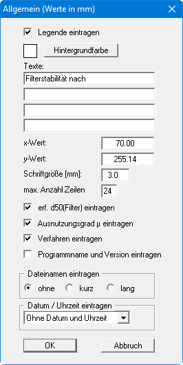 Nach Anwahl dieses Menüeintrags erscheint eine Dialogbox, die Ihnen die Einstellung der grafischen Darstellung einer Legende mit Ihren Eingabedaten und dem Berechnungsergebnis ermöglicht. Die Darstellung wird durch den Schalter "Legende eintragen" aktiviert.