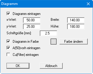 Beim Diagramm nach Cistin/Ziems wird der hinter den Ungleichförmigkeitskurven liegende Bereich mit der unter dem Knopf "Farbe ändern" definierten Farbe hinterlegt, wenn der Schalter "Diagramm mit Farbe" aktiviert ist. Bei der Berechnung der Suffosionssicherheit nach Kenney/Lau und Burenkova oder Anwendung eines der anderen Verfahren aktivieren und ändern Sie darüber die Farbdarstellung der Prüfbereiche. In der oben dargestellten Dialogbox für das Verfahren nach Cistin/Ziems können Sie zusätzlich die Darstellung von "A(50)vorh" und "Cu(Filter)" aktivieren.