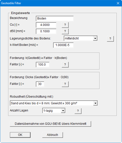 Wenn Sie zuvor eine Korngrößenanalyse mit dem Programm GGU-SIEVE (ab Version 14) durchgeführt haben, können Sie die benötigte Korngröße bei d50 und den Ungleichförmigkeitsgrad Cu im Programm GGU-SIEVE über den dortigen Menüeintrag "Bearbeiten / Filterstabilität" Schalter "Filterstabilität von geotextilen Filtern prüfen" in die Windows-Zwischenablage kopieren. Klicken Sie dann in der obigen Dialogbox auf den Knopf "Datenübernahme von GGU-SIEVE übers Klemmbrett", um die zwischengespeicherten Daten in die Dialogbox zu übernehmen.