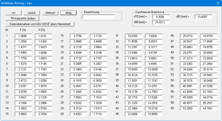 Wenn Sie zuvor eine Korngrößenanalyse mit dem Programm GGU-SIEVE (ab Version 14) durchgeführt haben, können Sie die benötigten Aufpunkte im Programm GGU-SIEVE über den dortigen Menüeintrag "Bearbeiten / Suffosion" Schalter "Suffosionssicherheit nach Kenney / Lau und Burenkova" in die Windows-Zwischenablage kopieren. Klicken Sie dann in der obigen Dialogbox auf den Knopf "Datenübernahme von GGU-SIEVE übers Klemmbrett", um die zwischengespeicherten Daten in die Dialogbox zu übernehmen.