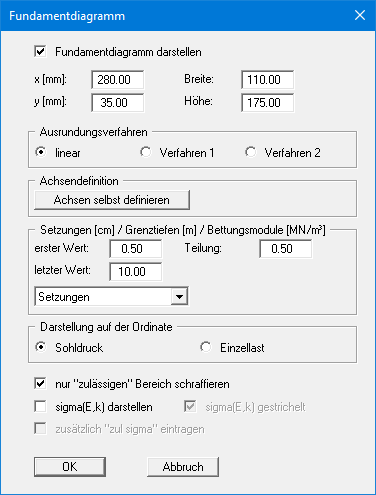 Dieser Menüeintrag erscheint nur im Berechnungsmodus "Mehrere Fundamente". Wenn der Schalter "Fundamentdiagramm darstellen" aktiviert ist, können Sie in der Dialogbox dieses Menüeintrags die grafische Darstellung des Fundamentdiagramms ändern.
