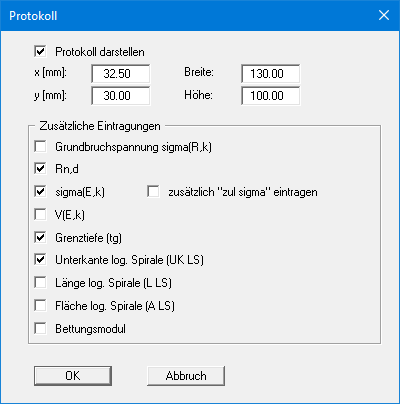 Mit den darunter liegenden Schaltern können Sie zusätzliche Eintragungen ins Protokoll übernehmen lassen. Wenn der Schalter "Bettungsmodul" aktiviert ist, wird die zu jedem Fundament berechnete charakteristische bzw. zulässige Bodenpressung durch die zugehörige Setzung geteilt und als Bettungsmodul ks in [MN/m³] aufgenommen.