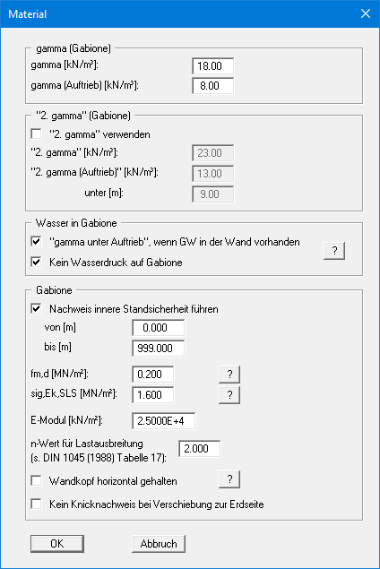 Das Programm bietet Ihnen die Möglichkeit, für die Berechnung unterschiedliche Wichten anzusetzen, wenn beispielsweise eine Gabionenwand mit einem Fundament vorliegt. Des Weiteren ist bei vorhandenem Grundwasser in der Gabionenwand die Berücksichtigung von "gamma unter Auftrieb" möglich. "E-Modul" kennzeichnet den E-Modul des Gabionenmaterials. Dieser Wert wird für die statische Berechnung der Wand benötigt.