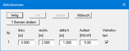 Wählen Sie aus dem Menütitel "Editor 1" den Menüeintrag "Bermen (Aktivseite)". Klicken Sie auf den Knopf "0 Bermen ändern" und geben Sie als neue Bermenanzahl eine 1 ein.