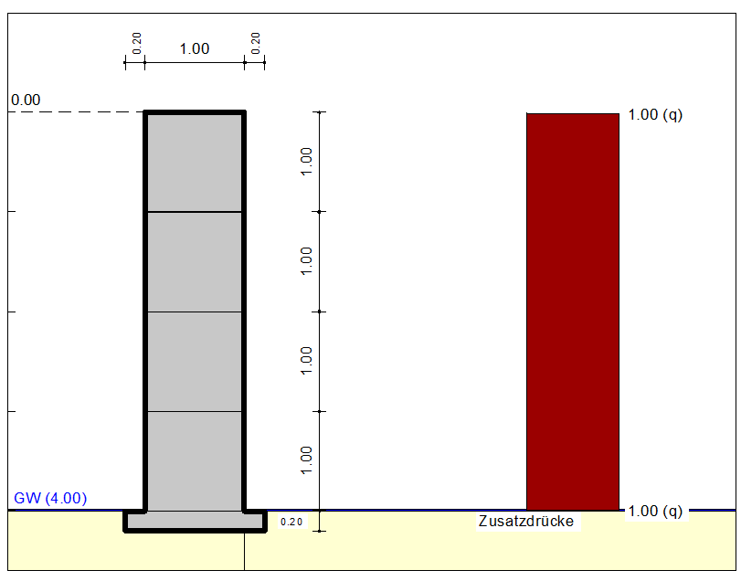 Es soll eine Lärmschutzwand mit einer Gesamthöhe von 4 Metern berechnet werden. Verwendet werden 4 Gabionenelemente mit einer einheitlichen Höhe und Breite von 1,0 m * 1,0 m. Die Lärmschutzwand wird auf einem 1,4 m breiten Fundament gegründet, das 0,2 m in mitteldicht gelagerten Sand einbindet. Der Bemessungsgrundwasserstand liegt auf Geländeoberkante. Es soll eine Windbelastung von 1,0 kN/m² angesetzt werden.
