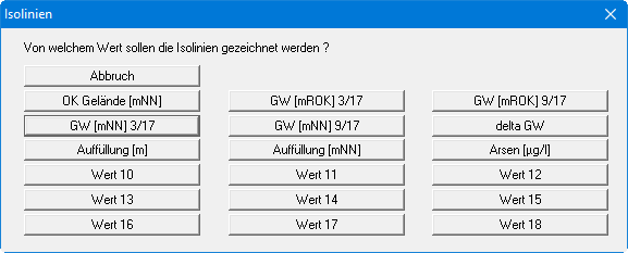 Mit diesem Menüeintrag können Sie die vorher eingegebenen Daten in Form von Isolinien darstellen lassen. Nach Anwahl des Menüeintrags wählen Sie in der folgenden Dialogbox zunächst den Messwert aus, den Sie in einem Isolinienplan darstellen wollen.