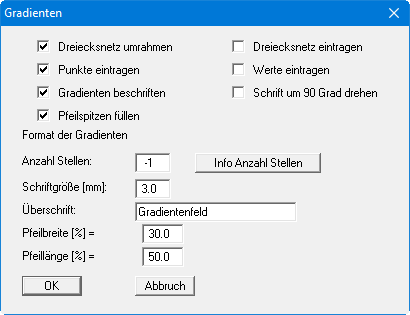 Weitere Einstellungen zu Form und Beschriftung der Gradientendarstellung können Sie in der folgenden Dialogbox festlegen, wenn Sie auf "Form der Darstellung" klicken. Die Schalter "Dreiecksnetz umrahmen", "Dreiecksnetz eintragen", "Punkte eintragen" und "Werte eintragen" entsprechen den Einstellungen für Isolinien unter dem vorherigen Abschnitt unter Knopf "Form der Darstellung".