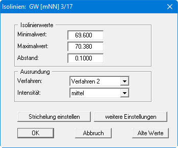 Wenn Sie den Knopf "Isolinien" anwählen, erscheinen immer die vom Programm automatisch ausgewählten Einstellungen. Über den Knopf "Alte Werte" werden die Einstellungen übernommen, die Sie bei der vorigen Isoliniendarstellung eingegeben haben. Diese Information wird mit dem Datensatz abgespeichert.