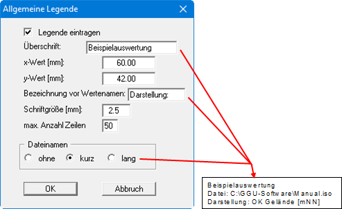 Über den Menüeintrag können Sie die Darstellung einer allgemeinen Legende erreichen. Die in der Dialogbox erfolgten Eingaben führen zu der dargestellten Legende.