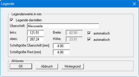 Mit den entsprechenden Eingaben definieren Sie die linke, obere Ecke der Legendenbox. Für die Festlegung der Breite und Höhe sollten immer die Schalter "automatisch" aktiviert sein, da dann die Größe der Legende an die Anzahl der dargestellten Messwerte und die Länge der Messwertnamen angepasst wird. Sie können weiterhin die Schriftgrößen für die Überschrift und die Messwertnamen angeben sowie eine Hintergrundfarbe für die Legende wählen.