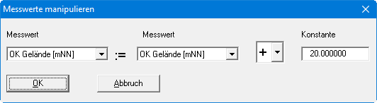 Analog zum vorherigen Abschnitt können Rechenoperationen auch mit einer Konstanten durchgeführt werden. Das kann z.B. dann sinnvoll sein, wenn Sie in einer ersten Phase der Auswertung eine fehlerhafte NN-Höhe für OK Gelände eingegeben haben. Sie können dann für alle Messpunkte diesen Messwert korrigieren, indem Sie als Konstante den entsprechenden Korrekturwert eingeben.