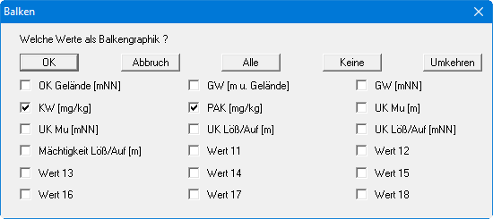 Nach Anwahl des Knopfes "normal" kennzeichnen Sie in der ersten Dialogbox die Messwerte, die als Balkendiagramm dargestellt werden sollen. Wenn Sie mehrere Messwerte kennzeichnen, dann werden die Balken nebeneinander oder aber auch gestapelt dargestellt.