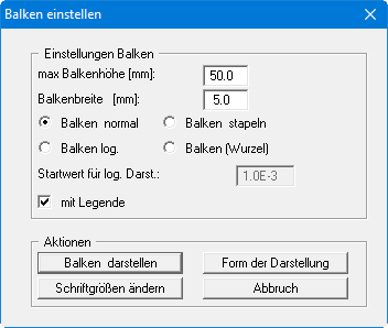 Über den Knopf "Form der Darstellung" können Sie analog zu den Erläuterungen unter Menüeintrag "Graphik / Isolinien (normal)" Abschnitt Knopf "Form der Darstellung" die Einstellungen für die Balkendarstellung ändern.