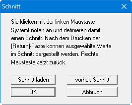 Durch Klicken auf "Schnitt laden" können Sie eine Schnittführung aufrufen, die Sie in einer vorangegangenen Sitzung gespeichert haben. Haben Sie in der aktuellen Sitzung bereits einen Schnitt definiert, können Sie den jeweils vorherigen Schnitt über den Knopf "vorher. Schnitt" aufrufen. In beiden Fällen wird zunächst die Schnittführung auf dem Bildschirm dargestellt und muss durch Drücken der [Return]- oder [Enter]-Taste bestätigt werden.