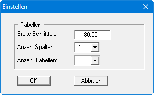 Im Eingabefeld "Breite Schriftfeld" stellen Sie die Breite der linken Tabellenspalte mit der Beschriftung ein, die Angabe erfolgt in [mm]. In den beiden Auswahlfeldern der Dialogbox können Sie die Anzahl der Spalten (maximal 6) und die Anzahl der Tabellen (max. 4) bestimmen. Weitere Veränderungen der Tabellendarstellung sind über den Menüeintrag "Formblatt / Tabelle" möglich (siehe Abschnitt 5.4.10).