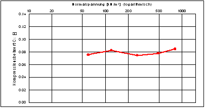 In dieser Gleichung ist bereits eingearbeitet, dass die effektiven Vertikalspannungen Funktionen des Ortes z innerhalb der Schicht und der Zeit t während des Konsolidiervorgangs sind. Weiterhin ist berücksichtigt, dass die Porenzahl sich linear mit dem Logarithmus der Spannungsänderung ändert. Daraus folgt, dass der Kompressionsbeiwert CC eine Konstante ist. Zu dem Beispiel in obiger Abbildung gehört die Auswertung in der nachfolgenden Abbildung (Spannung-Kompressionsbeiwert-Beziehung im Programm GGU-OEDOM), die zeigt, dass im vorliegenden Fall der Kompressionsbeiwert CC über den gesamten Spannungsbereich nahezu konstant ist (CC ≈ 0,08). Nur dann können Berechnungen nach diesem Ansatz durchgeführt werden.