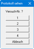 Standardmäßig erhalten Sie auf dem Bildschirm die grafische Darstellung Ihrer Durchlässigkeitsversuche. Über den Menüeintrag "Protokoll sehen" wechseln Sie zur Protokolldarstellung. Sind mehrere Versuche vorhanden, erscheint zunächst folgende Dialogbox, in der Sie über die Knöpfe "1", "2" usw. die jeweiligen Versuche für die Protokolldarstellung auswählen.