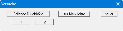 Die Nummerierung der Versuche schließt an die der vorhandenen Versuche (konstante Druckhöhe) an, d.h., wenn Sie bereits einen Versuch eingegeben haben, bekommt der neu eingegebene Standrohrversuch die Versuchsnummer "2". Der vorherige Versuch (mit konstanter Druckhöhe) kann demzufolge unter diesem Menüeintrag nicht angewählt werden. Sie können jedoch durch das Anwählen des Knopfes "Fallende Druckhöhe" zum Menüeintrag "Bearbeiten / Versuche konstant" wechseln, um den entsprechenden Versuch zu bearbeiten.