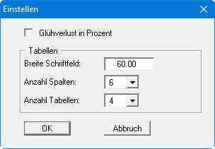Durch Aktivieren des Schalters können Sie einstellen, ob der berechnete Glühverlust in Prozent (z.B. 10,5 %) oder absolut (z.B. 0,105) ausgegeben wird. Wenn Sie die Einstellung verändern, müssen Sie darauf achten, dass Sie auch die Beschriftung in der Ergebnistabelle entsprechend anpassen (siehe Abschnitt 0).