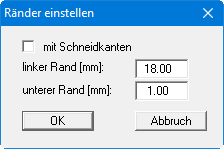 Durch Deaktivieren des Schalters "mit Schneidkanten" und entsprechende Wahl des linken und des unteren Randes gelingt es im Allgemeinen, eine nicht verkleinerte Druckausgabe zu erzeugen. Parallel dazu müssen Sie die Blatthöhe und die Blattbreite anpassen (siehe Abschnitt 5.4.1).