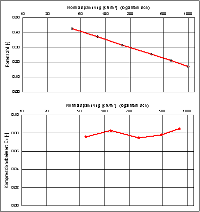 Im Gegensatz zur Auswertung mit Steifemodulen wird im oberen Diagramm die Porenzahl anstatt der Setzung dargestellt. Im unteren Diagramm erfolgt eine Auftragung der Kompressionsbeiwerte anstatt der Steifemodule.
