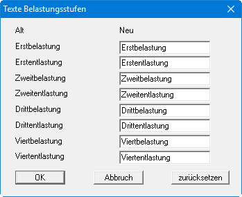 Über diesen Knopf in der obigen Auswahlbox erhalten Sie die folgende Dialogbox, in der Sie die Beschriftung der Belastungsstufen bearbeiten können.