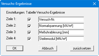 Über diesen Knopf in der obigen Auswahlbox erhalten Sie die folgende Dialogbox, in der Sie die Beschriftung der Eingabefelder der Versuchswerte und der Tabelle der Auswertungsergebnisse auf dem Formblatt bearbeiten können: