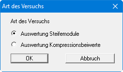 Um einen neuen Versuch einzugeben, entscheiden Sie zunächst in einer Dialogbox über die Art der Versuchsauswertung, wobei eine Auswertung über Steifemodule der Standardfall ist.