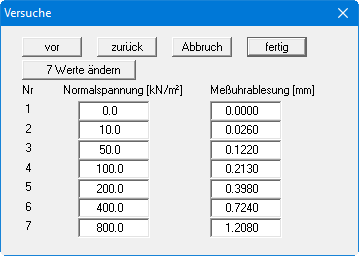 In dieser Dialogbox werden die für die Berechnung der Verformungen und Steifemodule relevanten Versuchsergebnisse, die Normalspannung [kN/m²] und die dazugehörige Messuhrablesung [mm] eingetragen.