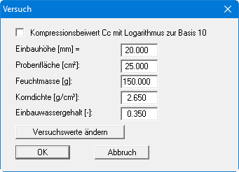 Sie geben hier zunächst die Grunddaten des Versuchs gemäß den theoretischen Grundlagen in Abschnitt 5.3 ein und können anschließend über den Knopf "Versuchswerte ändern" analog zur Dialogbox bei einer Auswertung über Steifemodule (siehe Abschnitt 6.2.2) Ihre Versuchsdaten eingeben bzw. ändern.