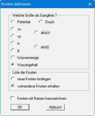 Wenn Sie für weitere Knoten Strömungsgrößen als Ganglinien auswerten lassen möchten, klicken Sie den Knopf "vorhandene Knoten erhalten", bevor Sie die Dialogbox verlassen. Nach Klicken auf "neue Knoten festlegen" werden die bisherigen Knoten aus der Liste gelöscht.