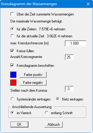 Nach Verlassen der Box mit "OK" werden die Wassermengen als größenvariable Kreise dargestellt. Bei einer Kreisfüllung werden positive und negative Wassermengen farblich unterschiedlich dargestellt.