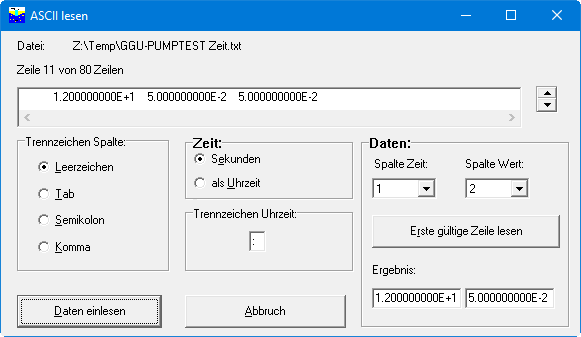 GGU-PUMPTEST: Menüeintrag "ASCII lesen"