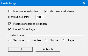 Falls der Ruhegrundwasserspiegel sich während des Versuchs ändert (siehe Menüeintrag "Bearbeiten / Ruhegrundwasser"), kann der zeitliche Verlauf zusammen mit den Messwerten dargestellt werden. Falls die Versuchsauswertung eine Regressionsberechnung beinhaltet, kann die Regressionsgerade dargestellt werden. Weiterhin können Sie die Zeitachse (Stunden, Minuten usw.) beeinflussen.
