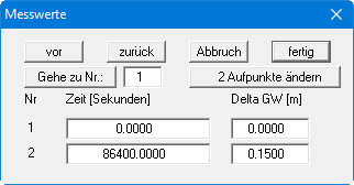 Falls sich während des Versuchs eine Veränderung des Ruhegrundwasserspiegels ergibt, die nicht durch den Pumpversuch erzeugt wird, sondern den Versuch überlagert (z.B. Tideeinfluss), können Sie hier einen Polygonzug definieren, der in Abhängigkeit von der Zeit diese Veränderung beschreibt, z.B.: