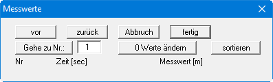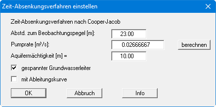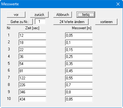 Bei diesen Werten handelt es sich um die Zeiten und die zugehörigen Absenkungen im Beobachtungsbrunnen gegenüber dem Ruhegrundwasserspiegel. Blättern Sie mit dem Knopf "vor" in der Tabelle, um die weiteren Werte einzugeben. Nach Verlassen der Eingabebox über den Knopf