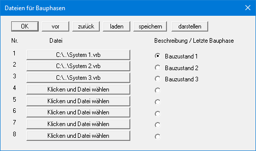 . Damit können Sie einfach zwischen den einzelnen Bauzuständen hin- und herschalten, so dass zeichentrickfilmähnliche Darstellungen der Biegelinie in den einzelnen Bauphasen möglich werden. Die Pfeilsymbole funktionieren natürlich nur dann, wenn Dateien ausgewählt wurden und Sie diese Dialogbox mit dem Knopf "darstellen" verlassen haben.