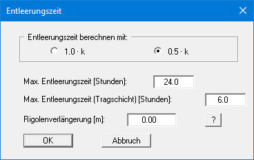 Bei Verwendung von Rigolensystemen können Sie die berechnete Entleerungszeit verkürzen, indem Sie hier eine Rigolenverlängerung vorgeben. Sie erhalten einen entsprechenden Hinweis bei Ihrer Berechnung und in der Ergebnislegende.