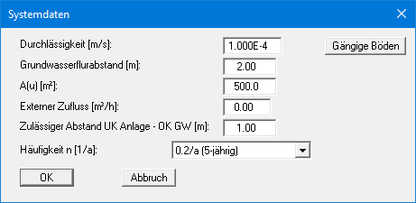 Unter diesem Menüeintrag geben Sie die wesentlichen Randbedingungen des Systems vor. Die Dialogbox ist je nach gewähltem Versickerungstyp unterschiedlich, siehe dazu die Beispiele in Abschnitt 6. Sie erhalten beispielsweise bei einer Muldenversickerung folgende Dialogbox: