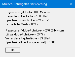 Jetzt können Sie die Mulden-Rohrrigolen-Versickerung berechnen. Wählen Sie dazu den Menüeintrag "System / berechnen" und erhalten folgendes Ergebnis: