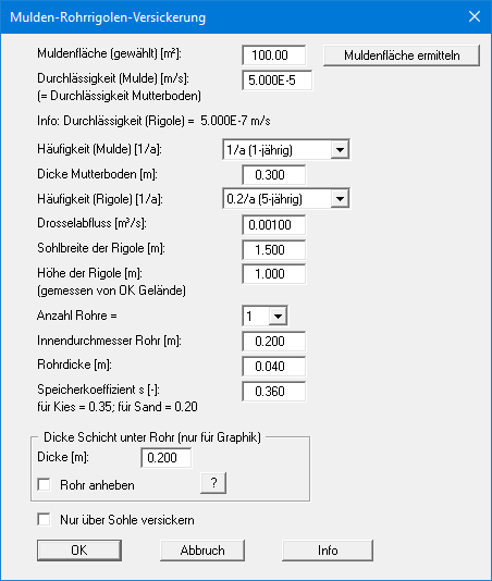 Bestätigen Sie Ihre Eingaben mit "OK". Wählen Sie anschließend den Menüeintrag "Bearbeiten / Mulden-Rohrrigolen-Versickerung" und geben Sie die Werte der folgenden Dialogbox ein.