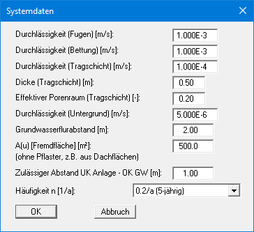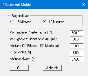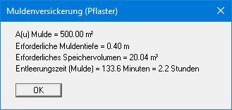 Ist dieser Wert größer als die Durchlässigkeit der Bettung oder des Untergrunds, wird der kleinere Wert verwendet. Die Mulde wird entsprechend einer Muldenversickerung nach DWA bemessen. Die für die Mulde angeschlossene Fläche A(u)(Mulde) ergibt sich aus: