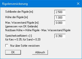 Bestätigen Sie Ihre Eingaben mit "OK". Wählen Sie anschließend den Menüeintrag "Bearbeiten / Rigolenversickerung" und geben Sie die Werte der folgenden Dialogbox ein.