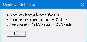 Jetzt können Sie die Rigolenversickerung berechnen. Wählen Sie dazu den Menüeintrag "System / berechnen". Sie erhalten das Ergebnis der Berechnung: